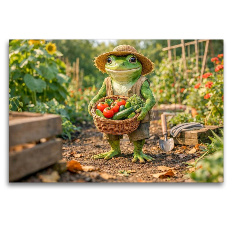 Der Garten zeigt sich von seiner großzügigen Seite. Unser Frosch trägt, was über viele Monate gewachsen ist, und blickt zufrieden auf sein Werk. Dieses Motiv steht für Fülle, Dankbarkeit und den schönen Spätsommermomenten.