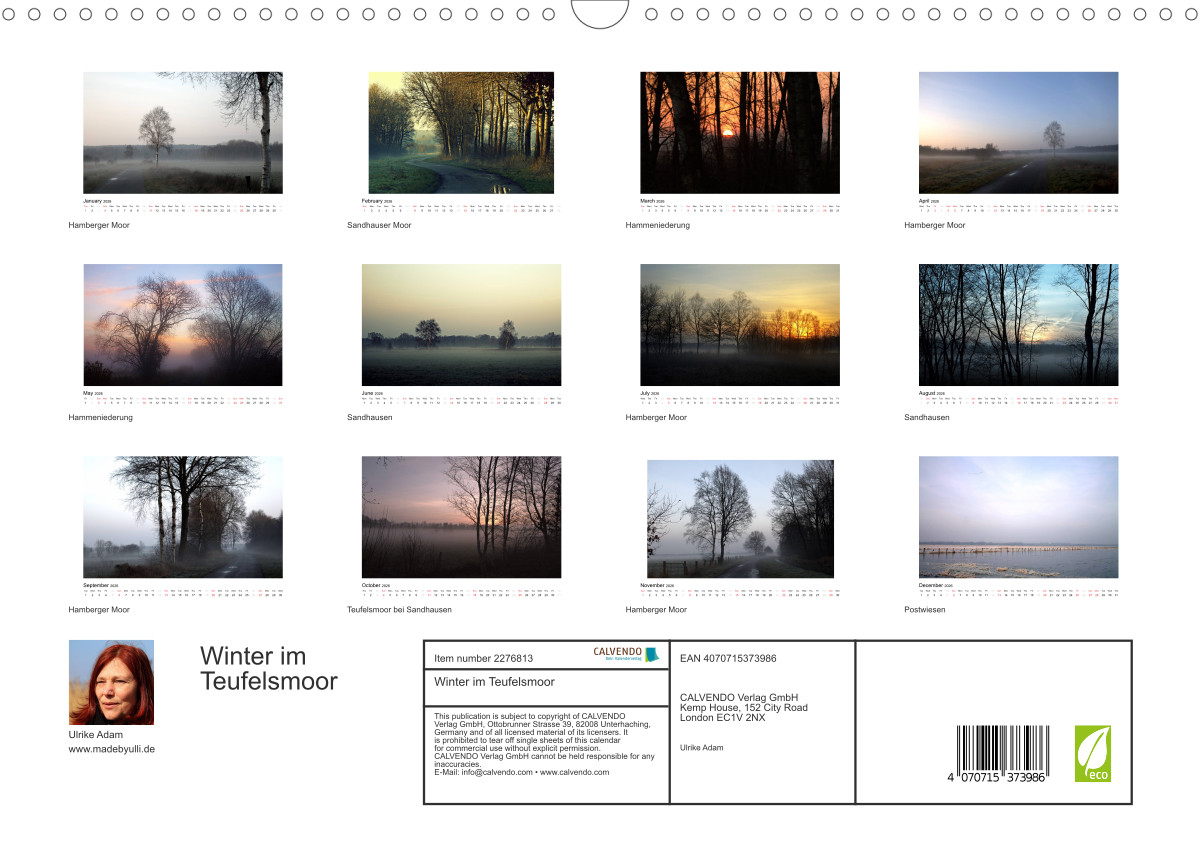 Das Teufelsmoor in der Nähe von Bremen, ist bekannt für seine wundervolle Landschaft. Schon vor vielen Jahren schätzten berühmte Künstler die besonderen Lichtverhältnisse und gründeten die Künstlerkolonie Worpswede. Ulrike Adam zeigt uns in diesem Kalender den winterlichen Charme dieser mystischen Landschaft.